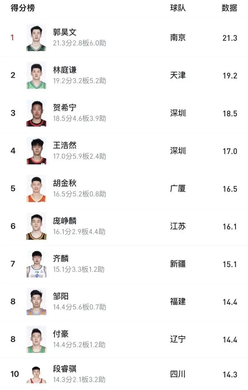 在目前联赛国内球员得分榜上,深圳占据了前五名的两位,其中贺希宁场均18.5分位列第三,王浩然17分排名第四,后者更是在国产前锋排名第一。